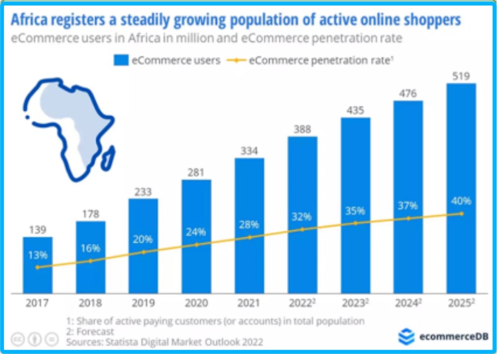EcommerceDB 研究指出,預計 2021 年至 2025 年間,非洲當地在線消費者將以 56% 的驚人速度增長,從 3.34 億增加到 5.18 億;與此同時,非洲電商滲透率預計將增長至 2025 年的 40%,未來非洲甚至有望超越亞洲成為全球電商用户最多的大洲。