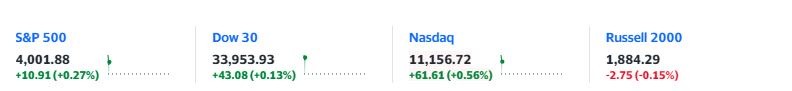 標普 500 指數高開 11.28 點,漲幅 0.28%,報 4002.25 點; 道瓊斯工業平均指數高開 37.64 點,漲幅 0.11%,報 33948.49 點; 納斯達克綜合指數高開 75.84 點,漲幅 0.68%,報 11170.95 點。