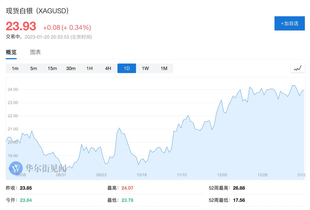從去年 10 月開始,現貨白銀進入了上升通道。1 月 20 日,白銀延續升勢,至 23.93 美元/盎司。