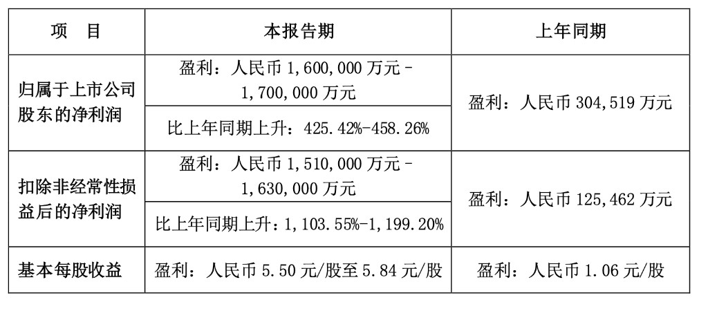 公告顯示,預計 2022 年淨利潤 160 億元-170 億元,同比增長 425.42%-458.26%,年度營業收入突破 4200 億元。