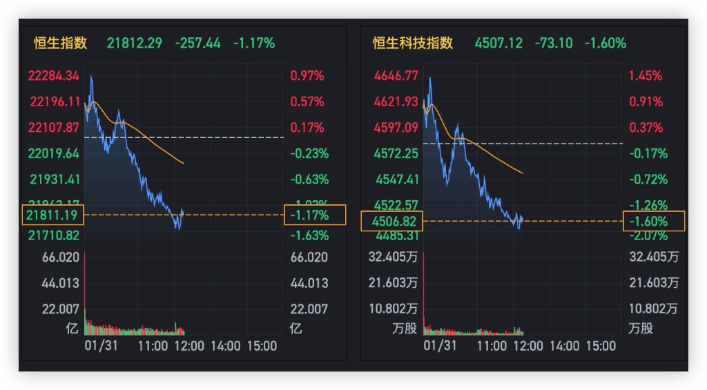 1 月 31 日週二,港股高開低走,連續第二日回調。早盤小幅高開後持續震盪下行。臨近午盤,恒指、恒生科技指數、跌幅均擴大至超 1%。截至發稿,恒指跌 1.17%,恒生科技指數跌 1.6%。
