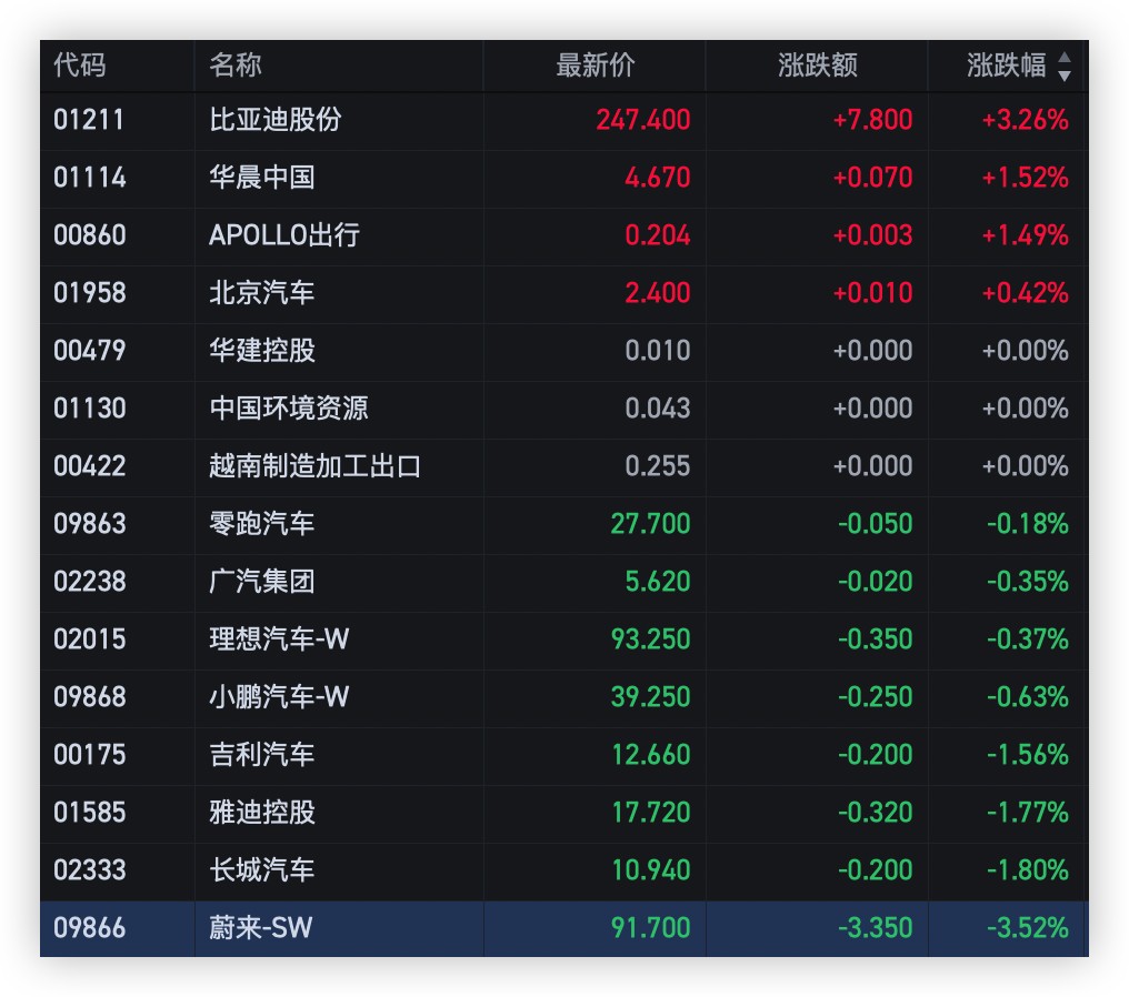 【13:10 更新】汽車股多股轉跌,蔚來跌超 3%,長城跌近 2%,吉利跌超 1%。
