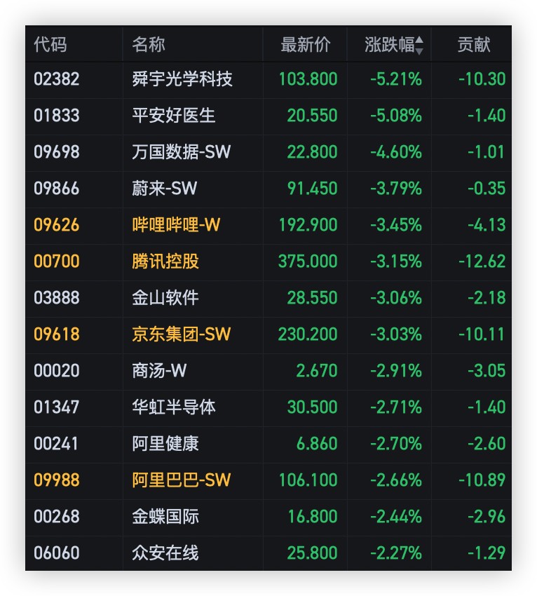 【13:10 更新】舜宇光學科技跌超 5%,B 站、騰訊、京東均跌超 3%,阿里跌近 2%。