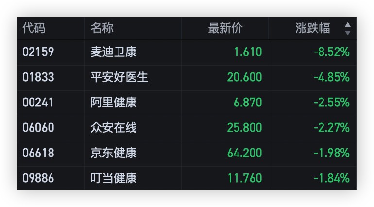 【13:10 更新】平安好醫生跌幅擴大至近 5%,麥迪衞康跌超 8%,阿里健康、眾安在線、京東健康等跟跌。