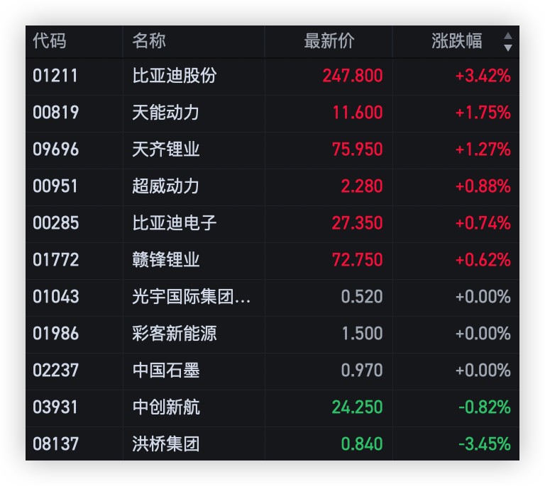 比亞迪股份漲超 3%,天能動力、天齊鋰業漲超 1%,超威動力、贛鋒鋰業登跟漲。