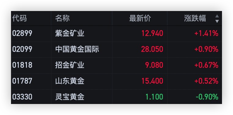 紫金礦業漲超 1.4%,中國黃金國際、招金礦業、山東黃金登跟漲。