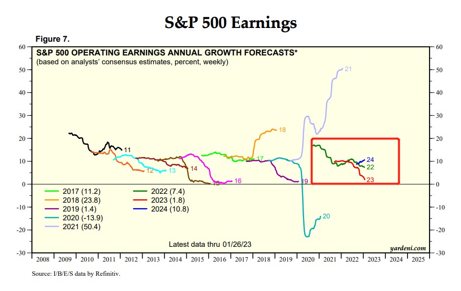 此外,一場分析師普遍預期的企業盈利衰退似乎正在發生。統計數據顯示,在第四季度報告季的大約一半時間裏,標普 500 指數成分股公司的利潤萎縮了 2% 以上。摩根士丹利首席股票策略師 Michael Wilson 曾表示,2023 年美股將迎來全球金融危機以來最糟糕的一年,預計標普 500 指數可能在 3000 點左右觸底,同時企業盈利也將遭遇同樣的命運。摩根士丹利團隊目前傾向於對 2023 年每股收益 180 美元的熊市預測,相比之下,分析師的平均預期為 231 美元。