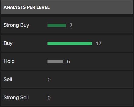 Refinitiv 近期針對 30 位分析師的調查顯示,他們總體上對該公司維持長期 “買入” 評級,其中 7 位分析師給予 “強烈買入”,17 位 “買入”,6 位 “持有”,沒有分析師給予 “賣出” 或 “強烈賣出” 建議。