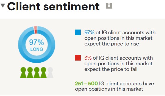從散户的角度來看 (截至 2023 年 2 月 3 日),持有迪士尼股票的券商 IG 的客户中有 97% 預計其股價將在短期內上漲,只有 3% 的客户預計股價會下跌。
