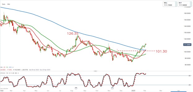 該股長期上行阻力目標位為 126.35 美元。如果它出現回調,股價跌破阻力位和位於 101.30 美元附近的 200 天均線,其上行趨勢假設需要重新評估。