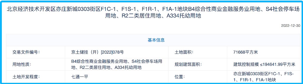北京越新此次競得的地塊為:北京經濟技術開發區亦莊新城 0303 街區 F1C-1、F1S-1、F1R-1、F1A-1 地塊 B4 綜合性商業金融服務業用地、S4 社會停車場用地、R2 二類居住用地、A334 托幼用地。