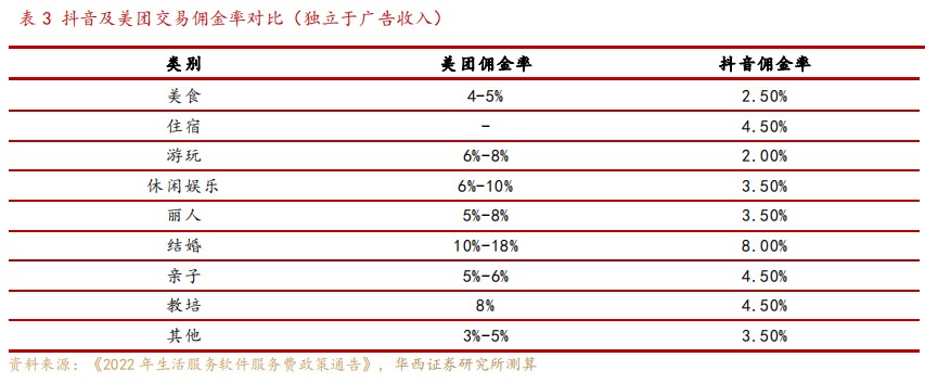 而抖音用户的娛樂目的性強,團購帶貨非常依賴內容趣味性以及達人推廣,商户也就相應地需付出更多內容成本,這也是為什麼儘管抖音平台佣金低於美團平台佣金,但加上達人佣金後,整體抽佣率要大於美團。以到餐為例,美團到餐佣金率為 3%,抖音為 2.5%,達人佣金率 3%-8%。