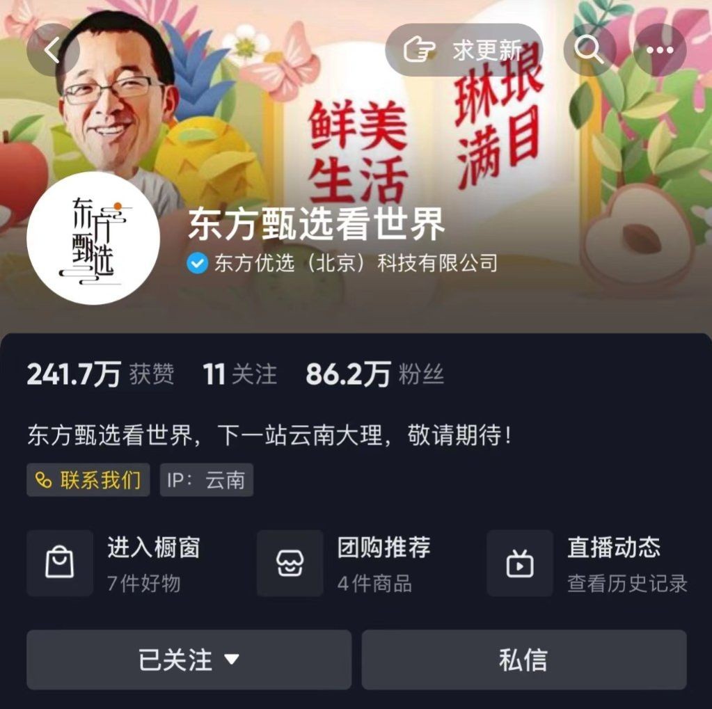 酒旅領域也值得關注,在疫情及出入境開放後,旅遊需求有望逐步回升。而且見智研究觀察到東方甄選的看世界賬號自去年底開播以來已經積累了一定觀看量和粉絲量,目前已經上架了 4 件旅遊團購商品,未來整個酒旅領域的 SKU 肯定也會更加豐富。
