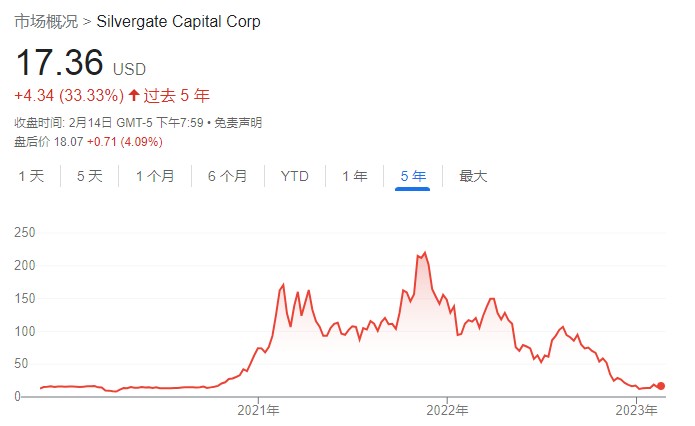 在去年幣圈動盪之後,由於與 FTX 存在往來關係,Silvergate Capital 股價從最高點時的 219.75 美元跌到如今僅剩 17 美元。
