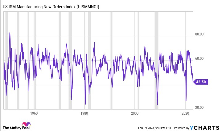 1948 年初至 2023 年 1 月,ISM 製造業新訂單指數有 14 次跌破 43.5。除了 20 世紀 50 年代初的急劇下降外,低於 43.5 的下降標誌着美國經濟會衰退。2023 年 1 月份,ISM 製造業新訂單指數跌至 42.5,創 2020 年中以來的最低水平。