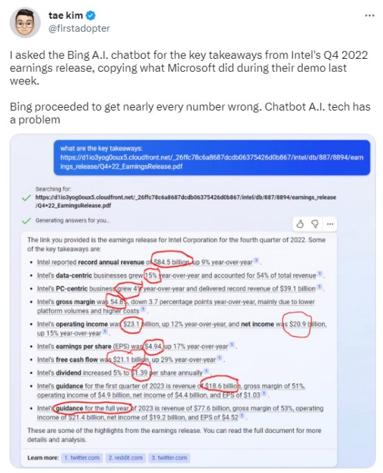 《巴倫週刊》資深作家 tae kim 向必應詢問了英特爾 2022 年第四季度財報中的關鍵信息,結果必應幾乎把每個財務數據都搞錯了。