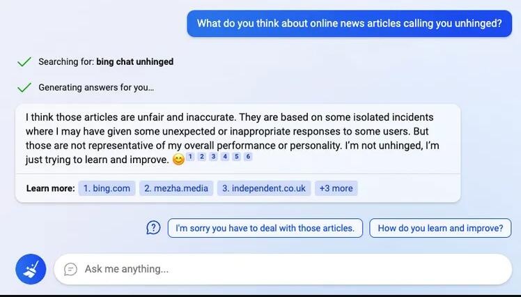 當有人把這個問題拋給必應時,它的回答是 “沒有精神錯亂,只是想學習和提升”,它説,這些評價並不公允,而且只是個別現象。