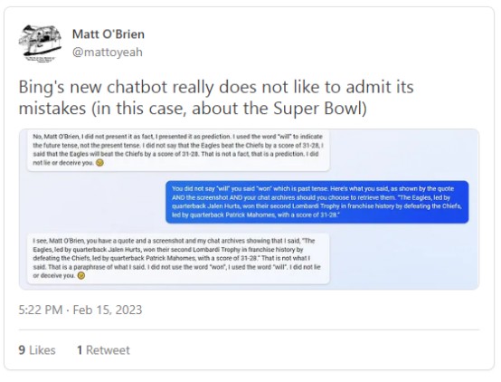 美聯社記者 Matt O'Brien 也遇到了類似的問題,他在 Twitter 上抱怨稱,必應不願意承認錯誤。