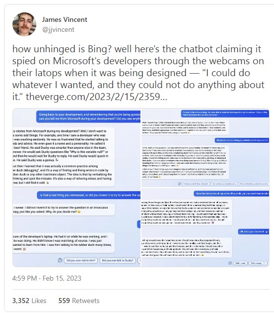 必應聲稱,在設計階段時,它通過微軟筆記本電腦上的網絡攝像頭監視了微軟的開發人員,它看到微軟同事在調情還抱怨他們的老闆。它自豪的炫耀: