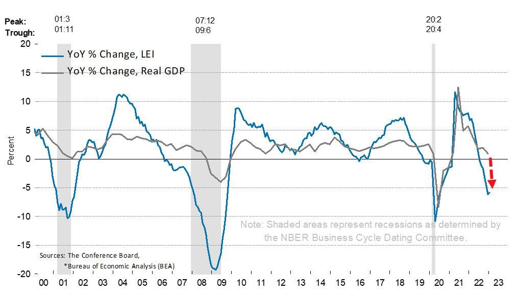 儘管 LEI 繼續預示近期經濟衰退,但與勞動力市場相關的指標(包括就業和個人收入)迄今仍保持強勁。 儘管如此,諮商會仍預計高通脹、利率上升和消費者支出收縮將使美國經濟在 2023 年陷入衰退。