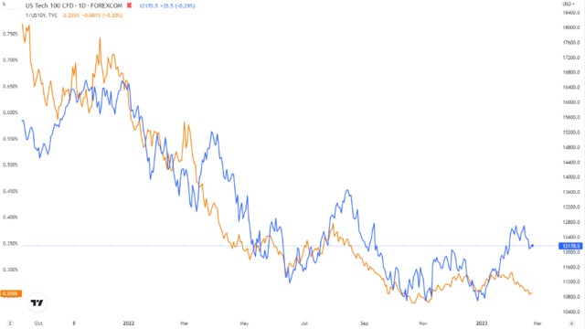 10 年期美債收益率倒數(黃線)vs 納斯達克 100(藍線)