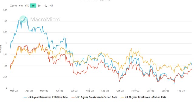 更關鍵的是,隨着近期美國多項經濟數據意外強勁,市場出現了經濟硬着陸,軟着陸之後的第三種猜測—不着陸,因此對未來數年的通脹預期出現了不同程度的回升。