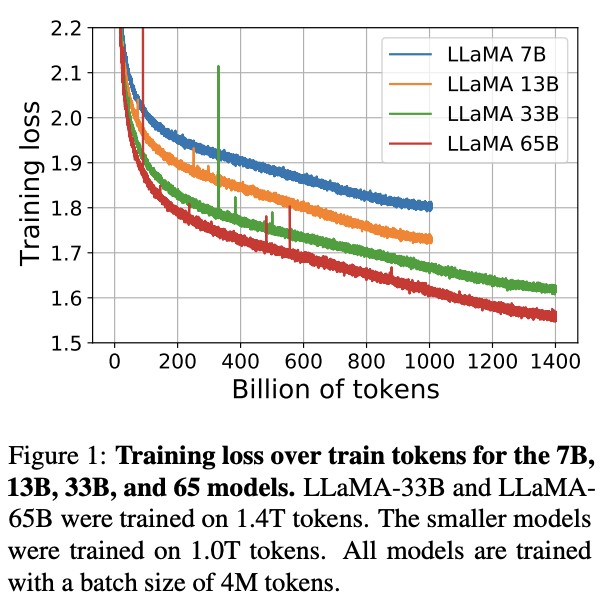 根據 Meta 官網介紹,LLaMA 包含 4 個基礎模型,參數分別為 70 億、130 億、330 億和 650 億。其中,LLaMA 65B 和 LLaMA 33B 在 1.4 萬億個 tokens 上訓練,而最小的模型 LLaMA 7B 也經過了 1 萬億個 tokens 的訓練。