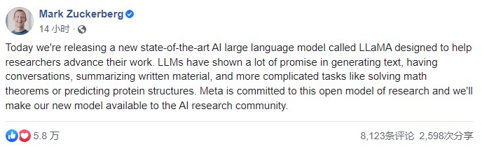 公司 CEO 扎克伯格在社交媒體上表示,LLaMA 旨在幫助研究人員推進研究工作,LLM(大型語言模型)在文本生成、問題回答、書面材料總結,以及自動證明數學定理、預測蛋白質結構等更復雜的方面也有很大的發展前景。