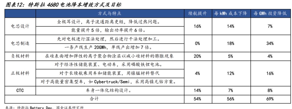自研 4680 電池進一步實現降本增效。公司在 2020 年電池日上表示,4680 電池實現降本增效的方式主要包括 5 個環節:電池設計、電芯製造、正極材料、負極材料、CTC(電池底盤一體化)。與 2170 電池相比,4680 電池的單體能量提高 5 倍,續航里程可提升 16%,功率提升 6 倍,每 kWh 成本有望下降 56%(14% 電芯設計 +18% 電芯製造 +5% 負極材料 +12% 正極材料 +7%CTC)。