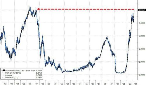 基準 10 年期美債收益率從鮑威爾講話前的 3.95% 左右一度重上 4.0%,刷新日高,聽證會結束後一度降至 3.95% 下方。對利率更敏感的 2 年期美債收益率在鮑威爾講話前處於 4.88% 下方,講話期間逼近 5.0%,刷新截至上週四連續五日所創的 2007 年 7 月以來高位,聽證會結束後,美股午盤時段,自 2007 年 7 月以來首次升破 5.0%。