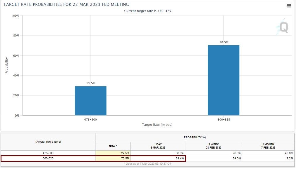 到美股收盤後,芝商所(CME)的 “美聯儲觀察工具” 顯示,美國聯邦基金利率期貨交易市場預計,3 月美聯儲加息 50 個基點的幾率從一天前的略超過 31% 升至 70% 以上,加息 25 個基點的幾率從一天前的接近 69% 降至不足 30%。
