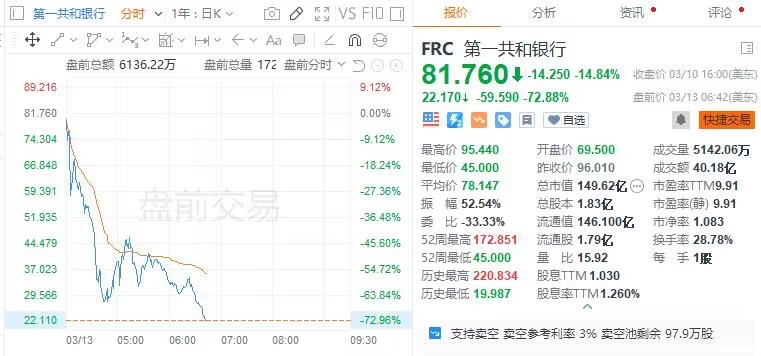 按今日盤前價計,自 3 月 9 日硅谷銀行暴雷事件以來,FRC 股價已跌超 80%。