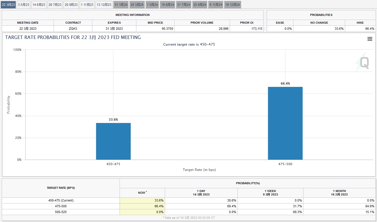 目前,芝加哥商品交易所的 FedWatch Tool 顯示,美聯儲在下週加息 25 個基點的可能性為 66.4%,而不加息的可能性為 33.6%(高於前一天的 30.6%)。