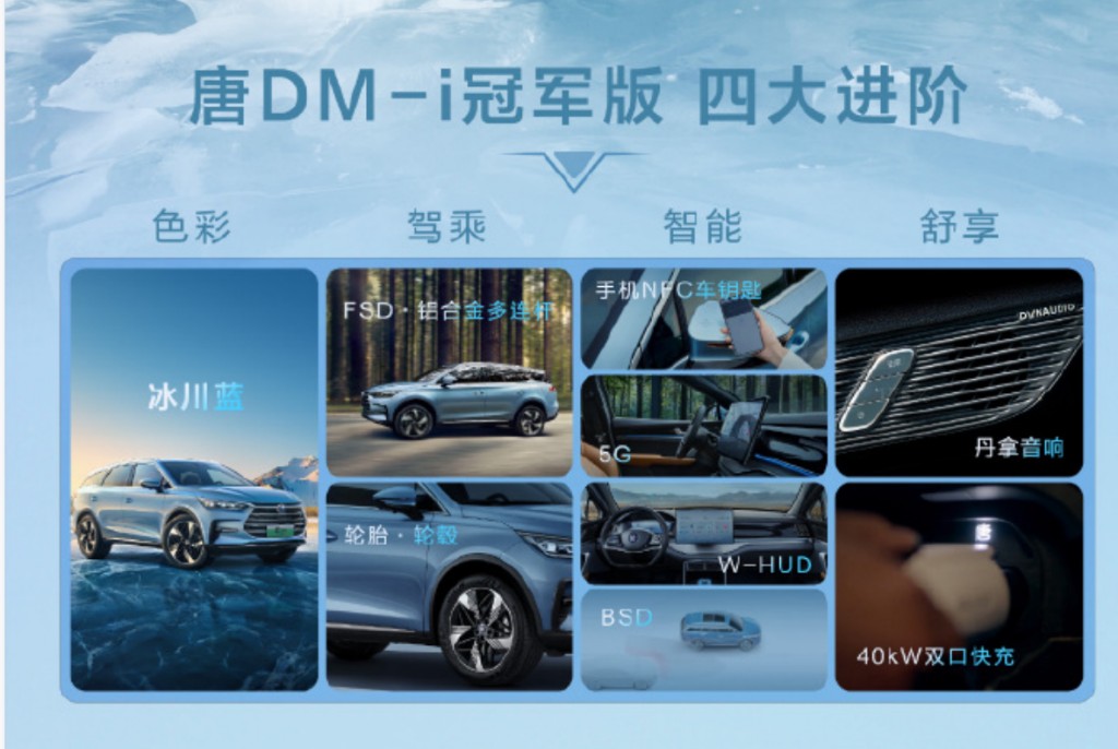 漢 EV 和唐 DM-i 的冠軍版均新增冰川藍車色,配置升級,充電時間縮短