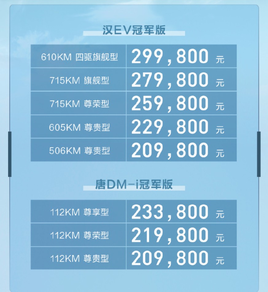 2023 款漢 EV 冠軍版共推出五款車型,售價在 20.98 萬至 29.98 萬元,繼續採用 EV Dragon Face 前臉設計,燻黑大燈加上黑化的側進氣口裝飾,展現出運動元素,續航里程將有 506km、605km、610km(四驅)、715km 四種。唐 DM-i 冠軍版共推出三款車型,售價在 20.98 萬至 23.38 萬元。