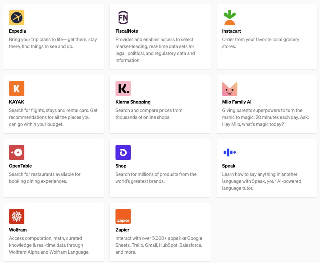 其次是來自其他公司的第三方插件。OpenAI 已經開放了第一批 ChatGPT 插件名單。這批插件由 Expedia、FiscalNote、Instacart、KAYAK、Klarna、Milo、OpenTable、Shopify、Slack、Speak、Wolfram 和 Zapier 創建。