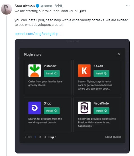 OpenAI 於 3 月 24 日宣佈,部分解除了 ChatGPT 無法聯網的限制。其 CEO 山姆•阿爾特(行情300825,診股) 曼(Sam Altman)表示,“我們正在開始推出 ChatGPT 插件,您可以安裝插件來幫助完成各種各樣的任務,我們很高興看到開發人員創造的東西!”
