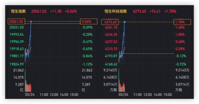 3 月 24 日週五,港股低開高走,截至發稿,恒指漲 0.06%,恒生科技指數漲超 1.78%。
