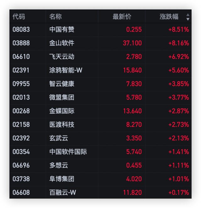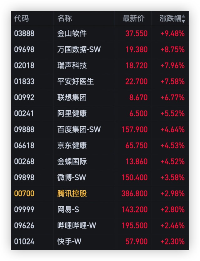 金山軟件漲超 9%,百度漲超 4%,騰訊、網易、B 站、快手均漲超 3%。
