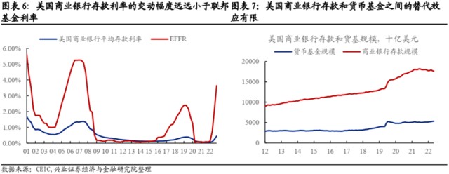 美國商業銀行負債成本的高粘性是維持正 carry 的主要原因。傳統上,美國商業銀行存款市場與貨幣市場存在割裂。美聯儲加息週期中,存款利率會上行,但上行幅度遠遠小於聯邦基金利率和其他貨幣市場工具。貨幣基金即使相比存款有更高的收益率,也不會對存款產生顯著的分流效應。另外,美國居民和企業,對商業銀行的選擇存在較強路徑依賴,這導致美國商業銀行存款端競爭烈度很低。美國銀行業整體存在非常強的地域性,比如美國第七大銀行 US Bank,在美國東海岸幾乎沒有網點。美國第九大銀行 PNC 與 US Bank 相反,其網點主要集中在東海岸,廣大中西部地區網點稀少。通常在美國某個特定地區,只存在少數幾家銀行的網點供當地居民和企業選擇。一旦開户,支票賬户和儲蓄賬户的使用慣性使居民和企業不會輕易更換開户行,因此存款競爭帶來的存款利率上行幅度十分有限。