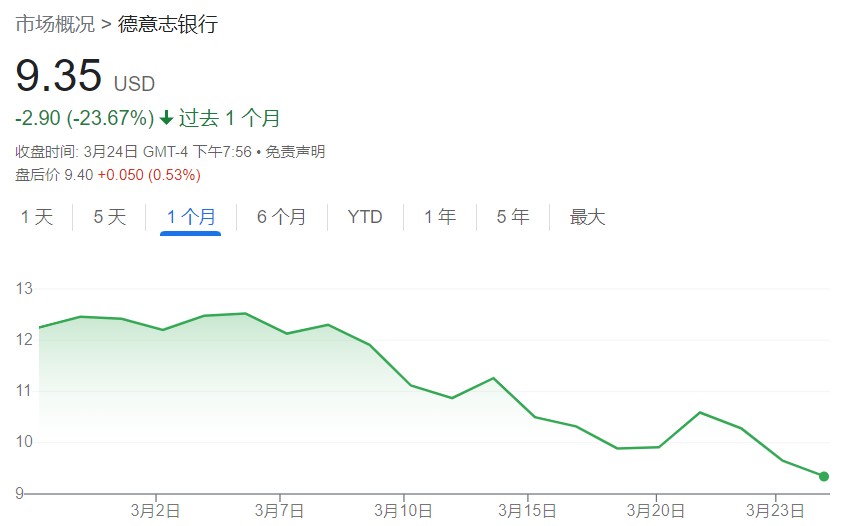 兩週前,隨着硅谷銀行的倒閉,美國銀行體系的問題就開始逐漸暴露,但現在風險已經遠遠不止於此:如果信貸活動萎縮,銀行們可能不得不提高貸款損失準備,它們的收益將受到嚴重影響。德意志銀行和法國興業銀行等大型銀行的股價在過去一個月下跌超過兩位數。