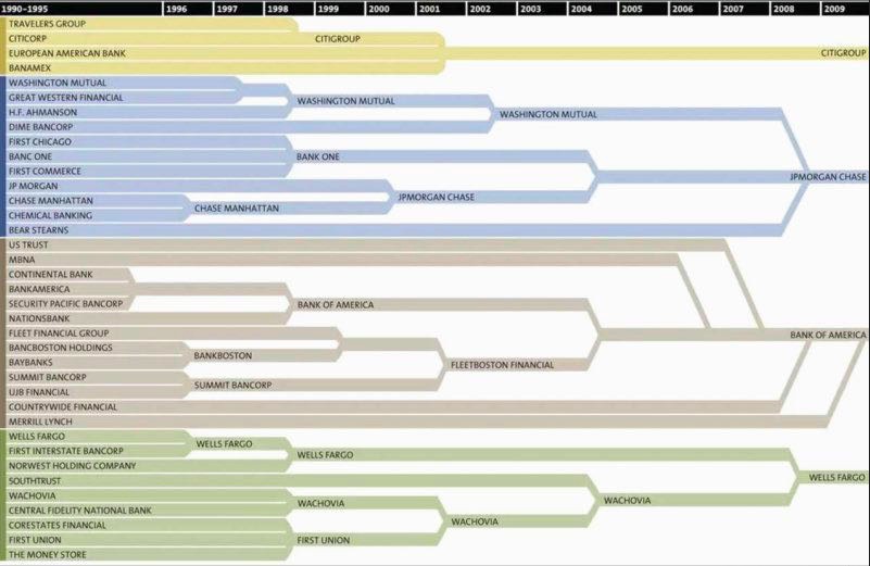 其實在美國銀行業,這樣的吞併並不少見。目前的美國四大銀行,花旗、摩根大通、美國銀行和富國銀行,都是通過不斷合併重組而來,這些銀行的前身都是無數家小銀行,比如花旗銀行前身是紐約城市銀行,但通過合併旅行者集團、歐美銀行、美國第一聯合資本等,成為一個超級巨無霸。