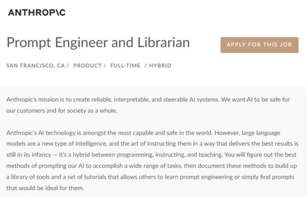 比如,谷歌投資的初創公司 Anthroic,正在舊金山招聘 “提示工程師和圖書館員” 一職,薪水高達 33.5 萬美元。