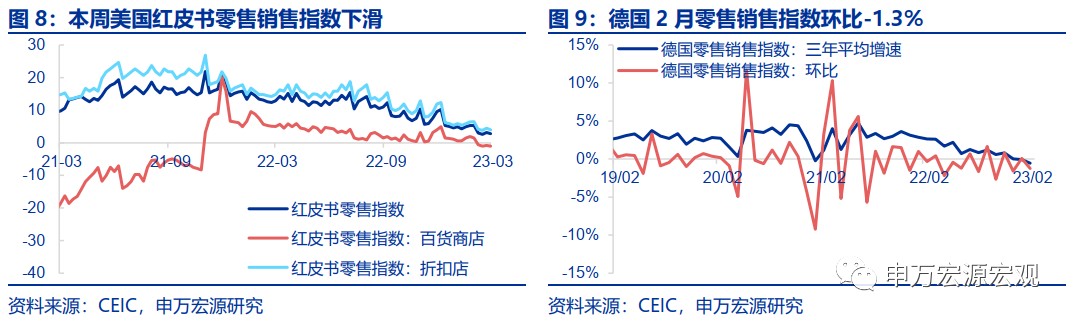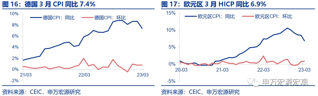 CPI 通脹:德國 3 月 CPI 較上月顯著放緩,同比 7.4%,環比 0.8%,通脹壓力稍減。受能源價格走低影響,歐元區 3 月 HICP 大幅下降,同比 6.9%,環比 0.9%。