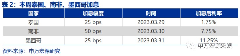 本週泰國央行宣佈加息 25bp,符合市場預期,連續五次加息後政策利率現為 1.75%。南非央行決定加息 50bp,高於市場預期,加息後利率來到 7.75%。墨西哥央行宣佈加息 25bp,加息後利率為 11.25%。