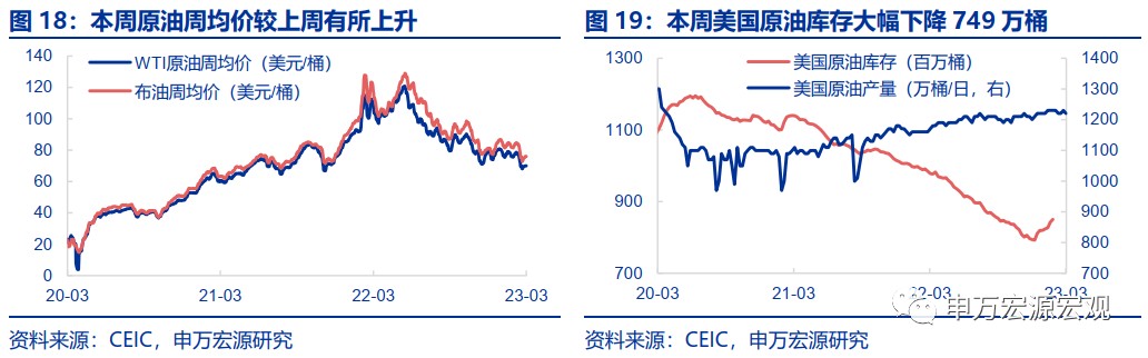 油價和 PPI:截至 3 月 31 日,布油周均價較上週上升至 76.1 美元/桶。本週美國原油庫存較上週大幅下降 749 萬桶,終止了此前庫存持續增加的態勢。原油產量下降至 1220 萬桶。