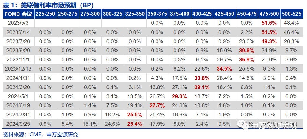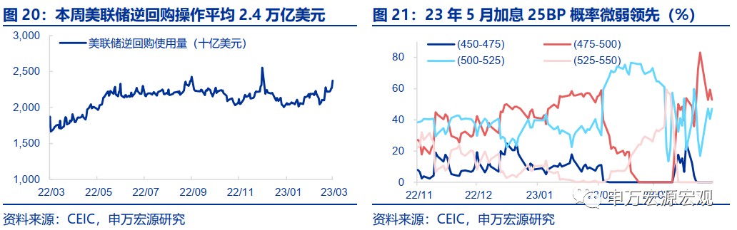 本週 10Y 美債利率、全球原油價格均較上週回升,布倫特油價已經回升至接近 80 美元/桶,10Y 美債利率也升至 3.5% 左右,脱離 3.3% 的低位,兩者其實反映的是市場對於金融風險的擔憂正在緩和。在市場恐慌情緒緩和下,本週市場對於美聯儲後續降息的時點預期也從 7 月推後到了 9 月,我們認為,鑑於目前金融風險演變為系統性風險的概率並不大,潛在的信用收縮對經濟的影響可能有所滯後,以及實體通脹風險仍然嚴重,美聯儲年內降息的概率是不大的。在這一假設下,我國貨幣政策操作外部約束可能不會大幅放鬆,但我國出口在美國超額儲蓄支持下或仍可獲得較好表現,從而支持人民幣年末回升至 6.6-6.7 左右。
