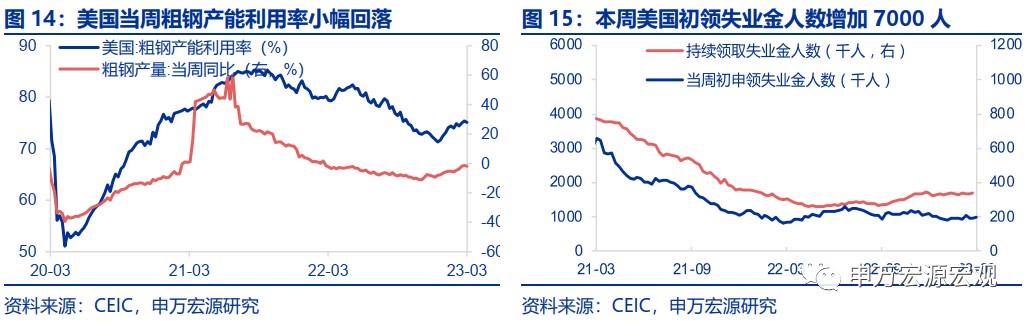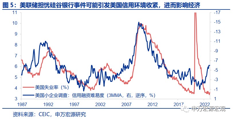 自美聯儲 3 月會議以來,後續美國經濟最大的不確定性在於美國中小銀行是否會收緊信貸,進而對美國經濟、通脹造成負面影響。但我們從下圖也可以看出,美國失業率目前和小企業的信用融資難度是背離的,後者自美聯儲去年開始加息之後就穩步收緊,其背後可能得到美國居民仍在 1 萬億美元左右的超額儲蓄的緩衝,由於美國居民收入端仍有保障,消費的持續火熱使得勞動力緊張程度同樣緩解較慢,側面反映美國企業經營情況仍然良好,從而美國小企業並沒有因為信用融資變難而進行裁員,最後導致失業率和信用融資難度的背離。根據我們測算,美國居民超額儲蓄可能要到今年三季度才消耗完畢,那麼在此之前,即便美國小銀行主動收緊信用環境,可能也不會對失業率造成大幅攀升的影響。
