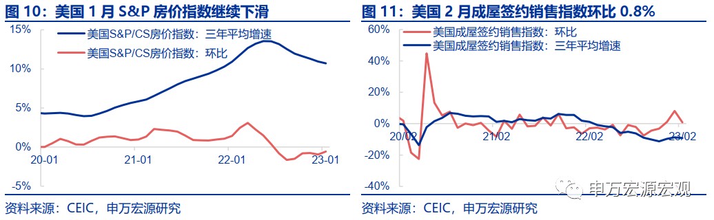 地產:美國 1 月 S&P 房價指數連續第七個月下滑,環比-0.6%,三年平均增速降至 10.7%。美國 2 月成屋簽約銷售指數連續第三個月上升,環比 0.8%,三年平均增速-9.1%。