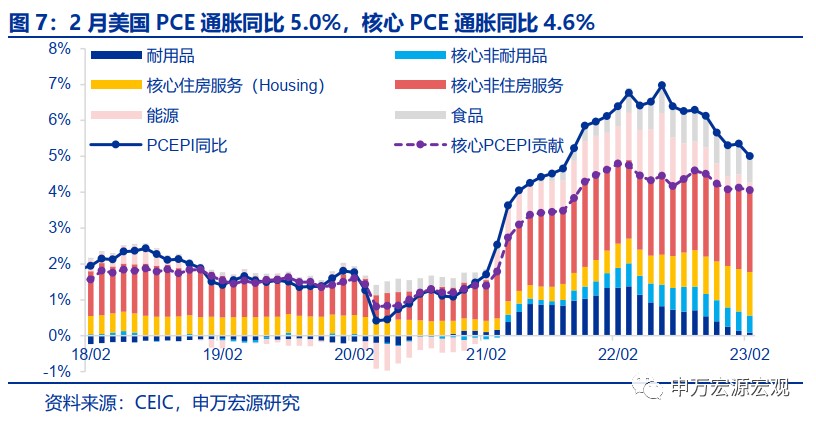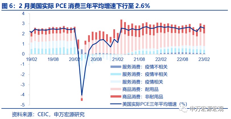 2 月實際 PCE 消費小幅降温,但服務通脹難以緩解,或使得美聯儲緊縮難放鬆。本週公佈的美國 2 月實際 PCE 消費三年平均增速下行至 2.6%,其中耐用品貢獻為主要拖累,但綜合近幾個月美國 PCE 消費增速來看,該水平仍然是較高的,市場所期待的消費大幅降温並沒有出現。這一消費表現傳導至 2 月 PCE 通脹中,我們也可以看到耐用品通脹同比貢獻的下行 (2 月美國 PCE 通脹同比 5.0%,核心 PCE 通脹同比 4.6%)。但和 CPI 結構一致的是,2 月美國服務通脹中無論是房租通脹還是其他服務通脹,對 PCE 通脹同比貢獻均是提升的,反映房租通脹年中之前難見緩解,以及美國居民超額儲蓄猶存下勞動力市場過熱緩解較慢,疊加上週公佈的美國服務業 PMI 反彈,美國服務通脹壓力仍然是很大的,從長期來説,即便職位空缺迴歸至疫情前的潛在增長水平,美國勞動力市場供需可能仍然難以平衡,也意味着美聯儲維持一段時間緊縮的必要性較大。